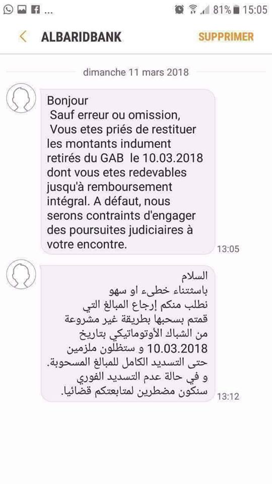 و أكد مواطنون أن ادراة "البريد بنك" أرسلت اليهم رسائل قصيرة جاء فيها "باستثناء خطأ أو سهو نطلب منكم إرجاع المبالغ التي قمتم بسحبها بطريقة غير مشروعة من الشباك الأوتوماتيكي بتاريخ 10.03.2018 و ستظلون ملزمين حتى التسديد الكامل للمبالغ المسحوبة و في حال عدم التسديد الفوري سنكون مضطرين لمتابعتكم قضائيا".