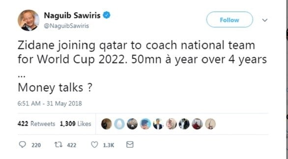 و كتب ساوريس في تغريدة على "تويتر": "زيدان سيتولى تدريب منتخب قطر لنهائيات كأس العالم 2022، وسيحصل على راتب 50 مليون يورو في الموسم الواحد ولمدة 4 مواسم".