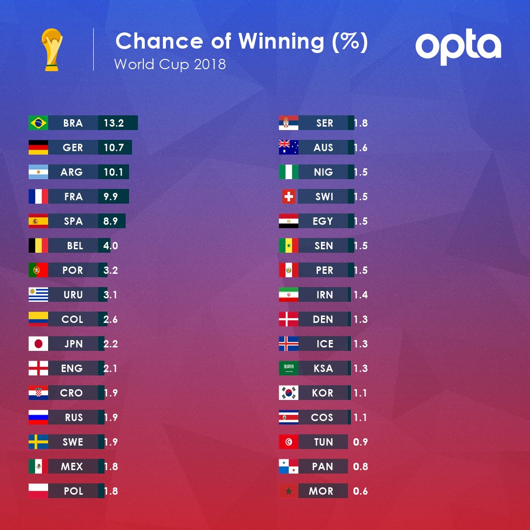 كشفت شبكة "أوبتا" العالمية المتخصصة في إحصاءات كرة القدم عن قائمة المرشحين للتتويج بالنسخة 21 من المونديال التي تستضيفها روسيا بداية من الخميس المقبل.