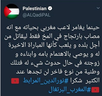 أدهشت الروح الوطنية العالية التي تحلى بها نجم المنتخب المغربي نور الدين أمرابط، والذي بصم على أداء قتالي لا مثيل له، أشقاءنا في دولة فلسطين، حيث نشرت إحدى الصفحات الفلسطينية تغريدة على تويتر رفعت فيها القبعة للاعب المغربي.