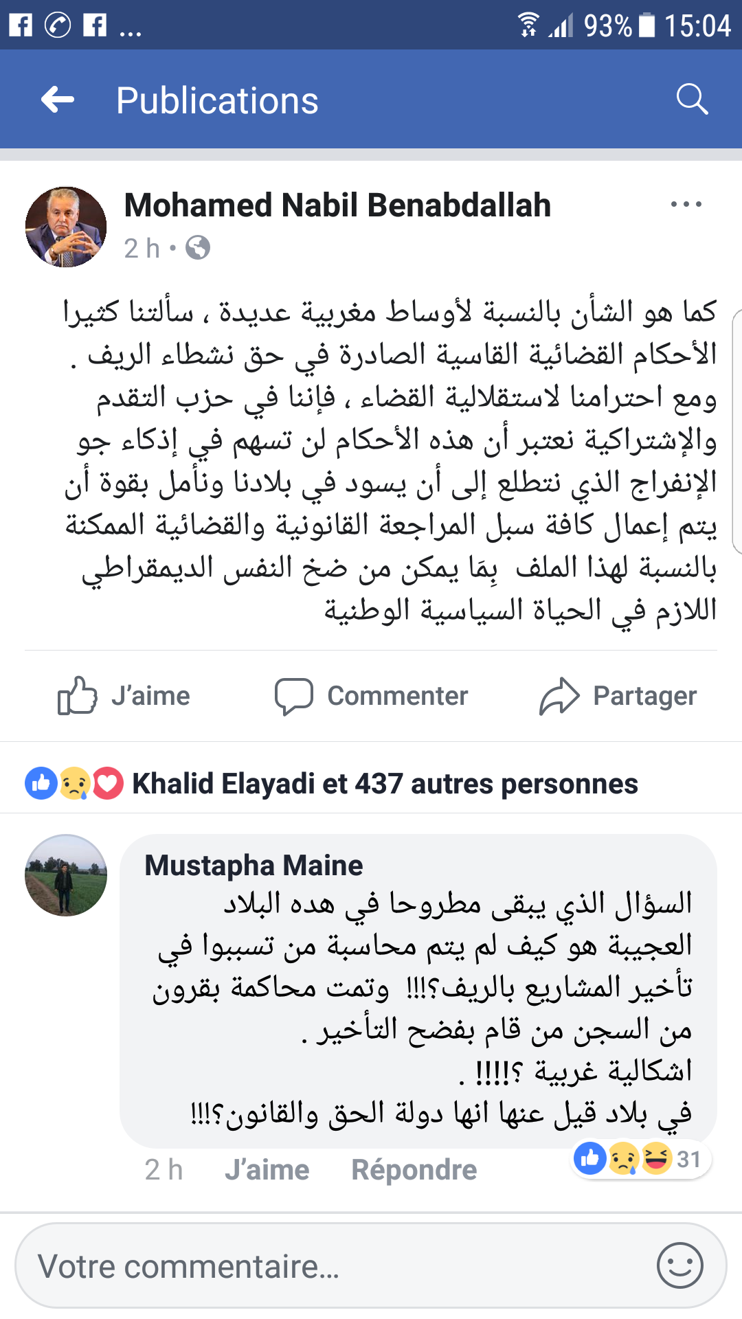 في تعليق له على الأحكام القاسية التي وزعت تباعا على معتقلي " حراك الريف "، نشر السيد نبيل بن عبد الله، الأمين العام لحزب " الكتاب " تدوينة عبر صفحته الرسمية على الفيسبوك، جاء فيها : " كما هو الشأن بالنسبة لأوساط مغربية عديدة ، سألتنا كثيرا الأحكام القضائية القاسية الصادرة في حق نشطاء الريف ".