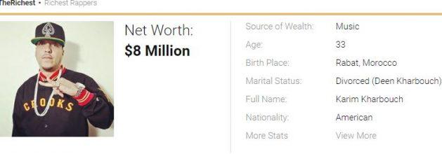 كشف موقع "ذا ريتشست" العالمي، أن مغني الراب المغربي "كريم خربوش" الشهير ب"فرانش مونتانا" ، يتوفر على ثروة تناهز 8 ملايين دولار، أي ما يعادل 8 مليار سنتيم .
