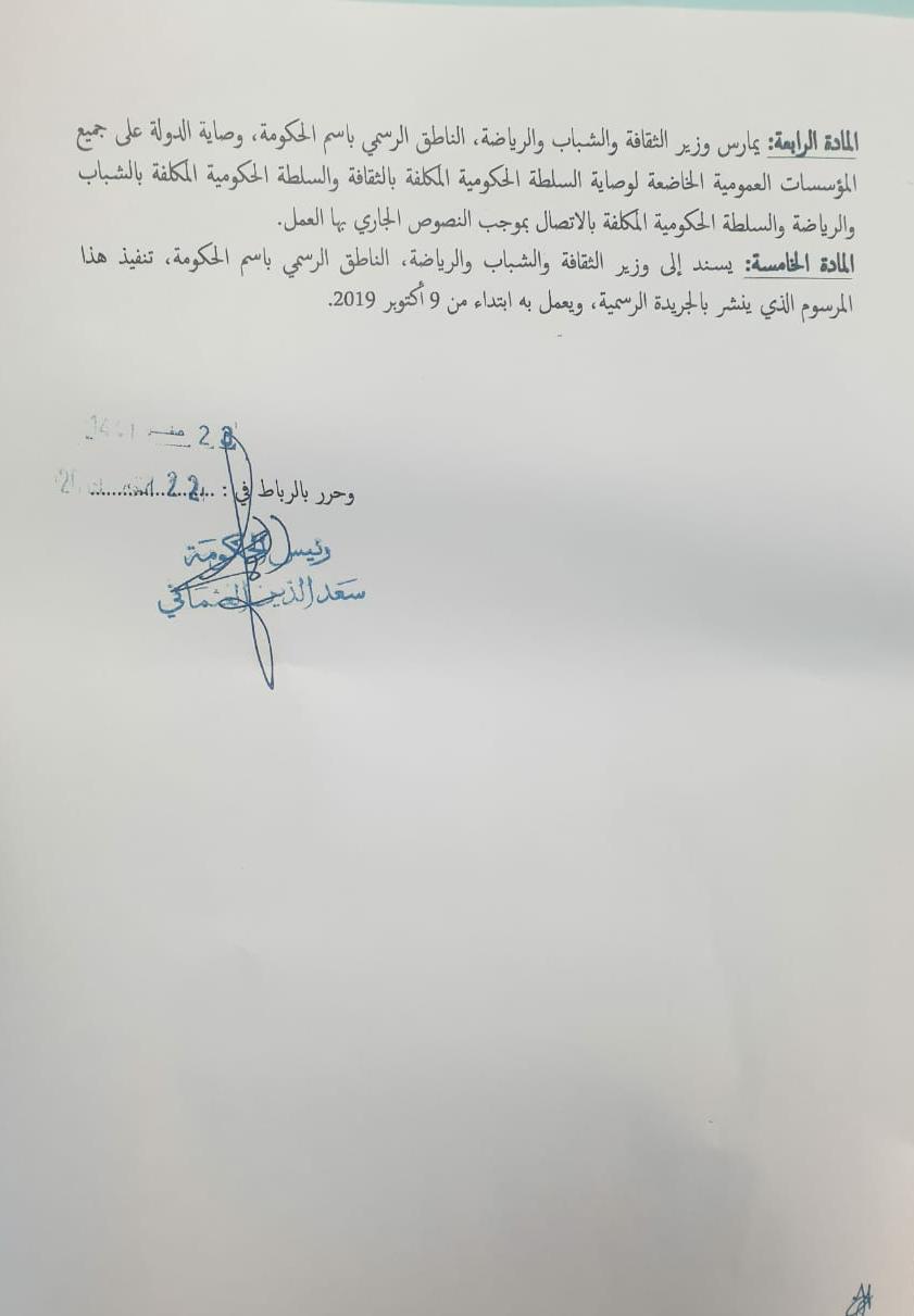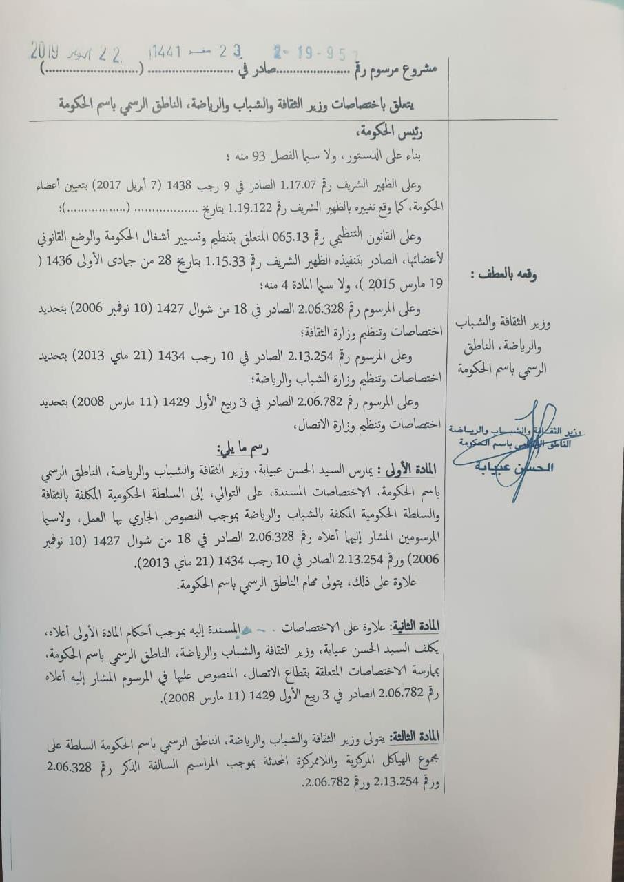 وقع رئيس الحكومة سعد الدين العثماني مشروع مرسوم سينشر في الجريدة الرسمية يقضي بإلحاق جميع المؤسسات التابعة لوزارة الإتصال سابقا، بوزارة الثقافة والشباب والرياضة، ووكل مهام الإشراف عليها إلى الحسين عبيابة وزير الثقافة والشباب والرياضة الناطق الرسمي باسم الحكومة .