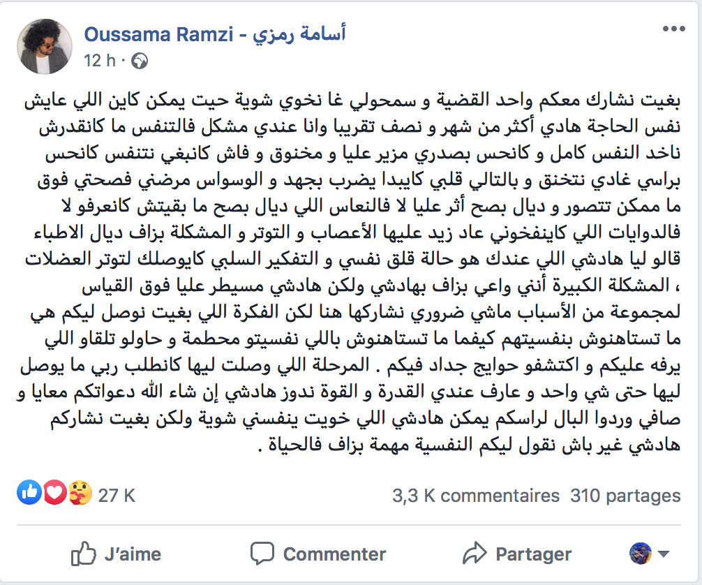 وتابع "رمزي" تدوينته قائلا: "المشكلة بزاف ديال الاطباء قالو ليا هادشي اللي عندك هو حالة قلق نفسي والتفكير السلبي كيوصلك لتوتر العضلات، المشكلة الكبيرة أنني واعي بزاف بهدشي ولكن هدشي مسيطر عليا فوق القياس لمجموعة من الأسباب ماشي ضروري نشاركها هنا"، قبل أن يؤكد: "الفكرة اللي بغيت نوصل ليكم هي ما تستهنوش بنفسيتهم كيفما ما تستهنوش باللي نفسيتو محطمة و حاولو تلقاو اللي يرفه عليكم، واكتشفو حوايج جداد فيكم".