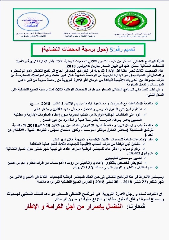 وأكدت التنسيقيات المذكورة أنها ستمتنع عن استقبال وتأطير وتكوين متدربي مسلك الإدارة التربوية، وزيارة المديريات والأكاديميات التعليمية، وعن قبول التكليفات لتسيير مؤسسات تعليمية، أو حتى تعويض الخصاص بالثانوي الإعدادي والتأهيلي من رؤساء المؤسسات من طرف النظار والحراس العامين … ( أنظر البيان ).