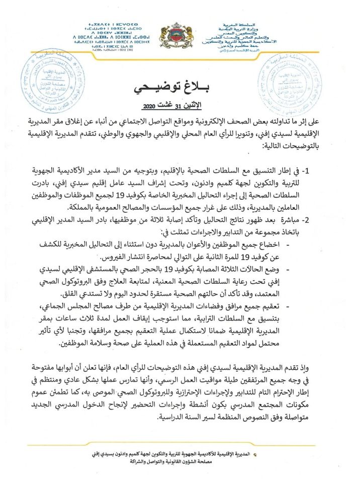 تعيش الأطر التعليمية بإقليم سيدي إفني على صفيح ساخن قد يؤثر على الدخول المدرسي بهذه المنطقة، والذي لا تفصلنا عنه سوى أيام قليلة، وذلك بعد إصابة 3 موظفين بالمديرية الاقليمية لوزارة التربية الوطنية بسيدي إفني بفيروس كورونا.