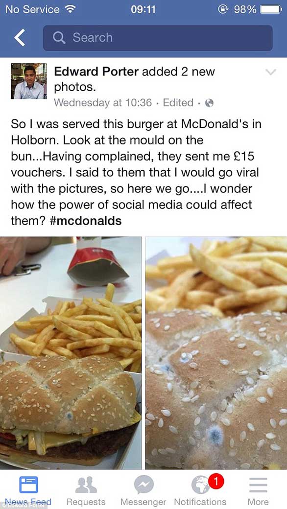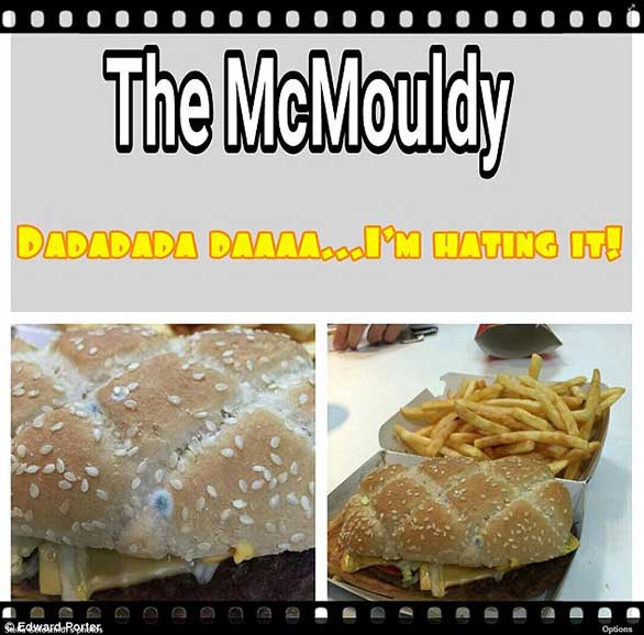 انزعج مدير تنفيذي بشركة برمجيات إدوارد بورتر عندما كان يتناول الغداء مع زملائه في ماكدونالدز هولبورن بلندن، وفجع عندما رأى الخبز المتعفن، فطالب الشركة وبالفعل لبته ودفعت له تعويضاً قسيمة بقيمة 30 يورو، كنوع من الاعتذار، الذي يراه إدوارد غير كافياً، بحسب صحيفة دايلي ميل البريطانية، الأمر الذي دفعه إلى نشر الصورة على فيس بوك تمت مشاركتها أكثر من 31 ألف مرة، دفعت زبائن آخرين لنشر صور على نفس الشاكلة، فنشر زبون صورة لساندويتش سمك متعفن أيضاً، وزبونة آخرى رفعت صورة لمشروب ساخن من ماكدونالدز بثقب وكتلة كبيرة من العفن داخل الكوب البلاستيكي، من أجل تحذير الزبائن لأخذ الحيطة والحذر من وجبات ومشروبات ماكدونالدز.