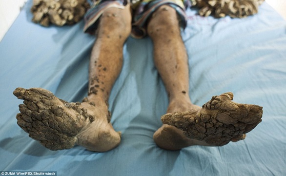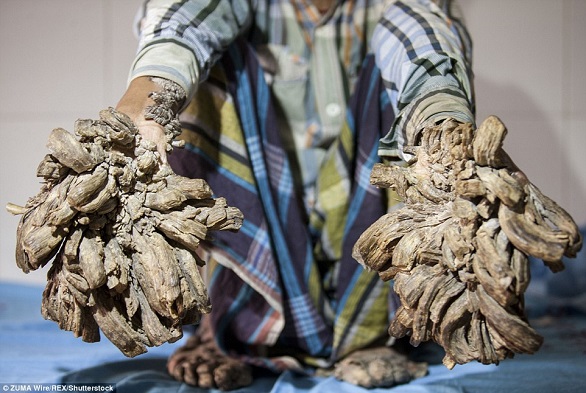 وتظهر أطراف الشاب أبول باجاندار (25 عاماً) من مدينة خولنا في بنغلاديش في الصور مغطاة بكمية كبيرة من الثآليل لدرجة أخفت ملامح أطرافه بشكل شبه كامل إثر إصابته بمرض جلدي نادر حين كان في الثامنة عشرة من عمره.