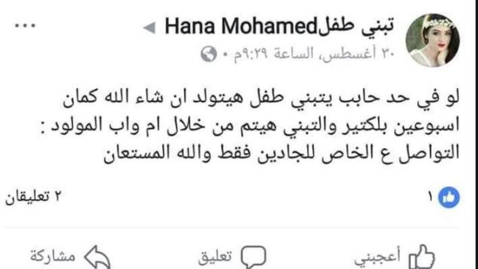 وكان نص الإعلان الذي نشرته سيدة تدعى هنا محمد في محافظة الإسكندرية على صفحة تسمى "تبني طفل"، يقول: "لو فيه حد حابب يتبنّى طفلا هيتولد إن شاء الله كمان أسبوعين بالكثير، والتبني هيتم من خلال أم وأب المولود.. التواصل على الخاص للجادين فقط".