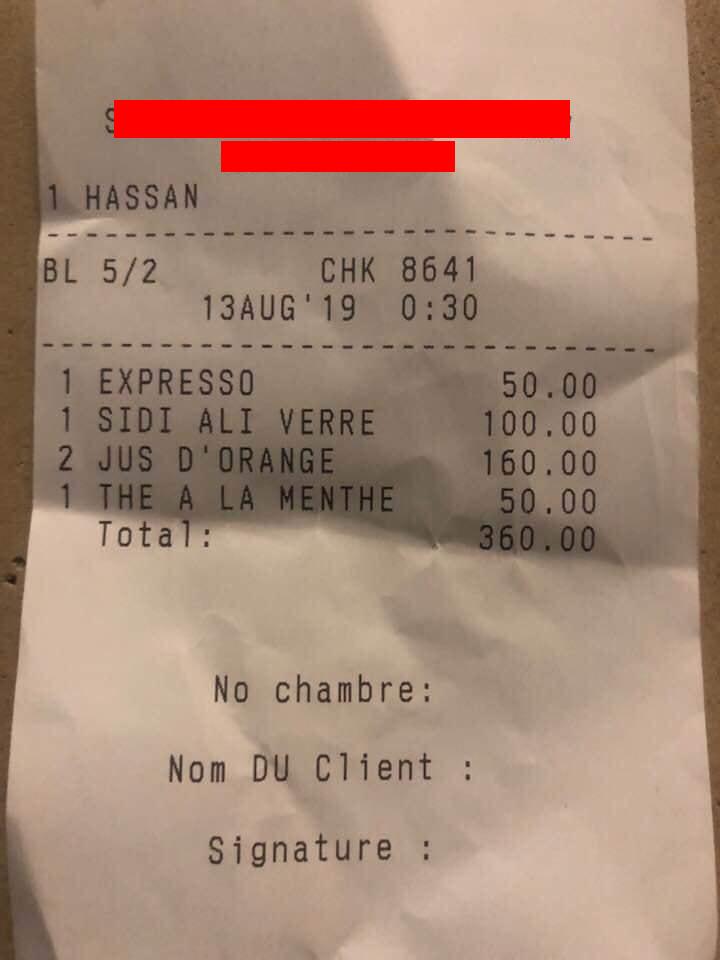 هذا، وأدى أحد الزبناء ما مجموعه 360 درهما كاملة، مقابل طلب كوب من القهوة، كوبين من عصير البرتقال، قنينة ماء، وبراد من الشاي، فقط!