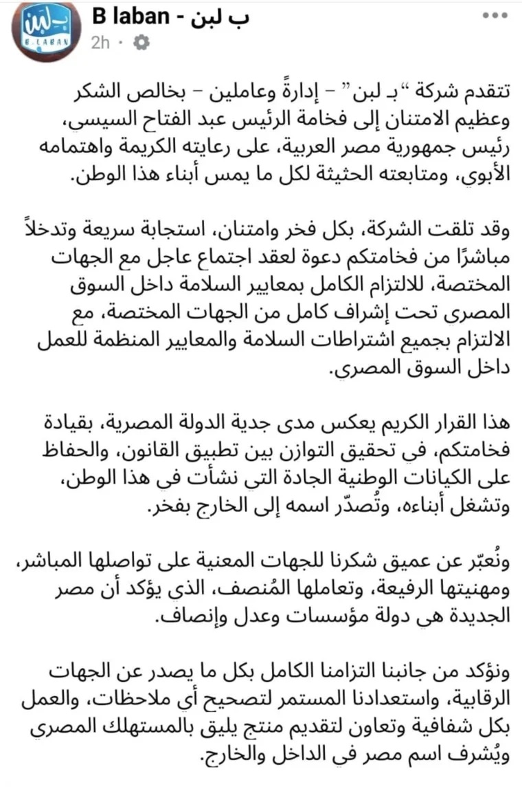 من جهتها، أعربت إدارة "بلبن" عن التزامها الكامل بتنفيذ التعليمات الرقابية، وأكدت أن الشركة ستتخذ جميع الإجراءات المطلوبة لتصحيح المخالفات وضمان جودة وسلامة منتجاتها. كما ثمّنت تدخل الرئيس، واصفة الخطوة بأنها دعم مباشر للقطاع الغذائي المسؤول، ولثقة المستهلك في المنظومة الرقابية المصرية.