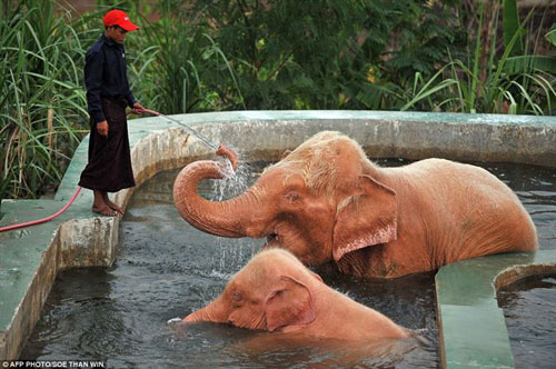 هذه الفيلة في الصورة هي في الواقع من نوع "الفيل الأبيض" لكنها ولدت بجلد بني محمر، يتحول للون قريب للوردي حين تتعرض للبلل.