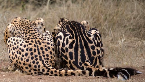 الفهد على يمين الصورة من أندر الأنواع، وجاء نتيجة لطغيان جين واحد على باقي جيناته.