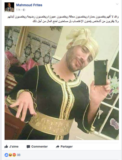 قام المخرج المغربي محمود فريطس بخرجة مثيرة عبر تدوينة نشرها على حسابه الفيسبوكي، قال فيها " والله لا أفهم يغتصبون حمارة ويغتصبون معاقة ويغتصبون عجوزة ويغتصبون رضيعة ويغتصبون أبنائهم.. ولا يقتربون من أشخاص يتمنون الإغتصاب بل مستعدون لمنح المال من أجل ذلك".
