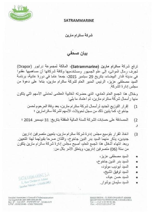وحسب البلاغ الذي يتوفر الموقع على نسخة منه، أنه خلال هذا الجمع العام العادي، الذي حضرته الغالبية العظمى لحاملي أسهم التي يتكون منها رأسمال شركة "ساترام مارين"، ثم إقرار التوزيع الجديد لرأسمال هذه الأخيرة، بعد وفاة المرحوم لحسن جاخوخ، كما يتبين ذلك من سجل تحويلات الأسهم للشركة حسب البلاغ.