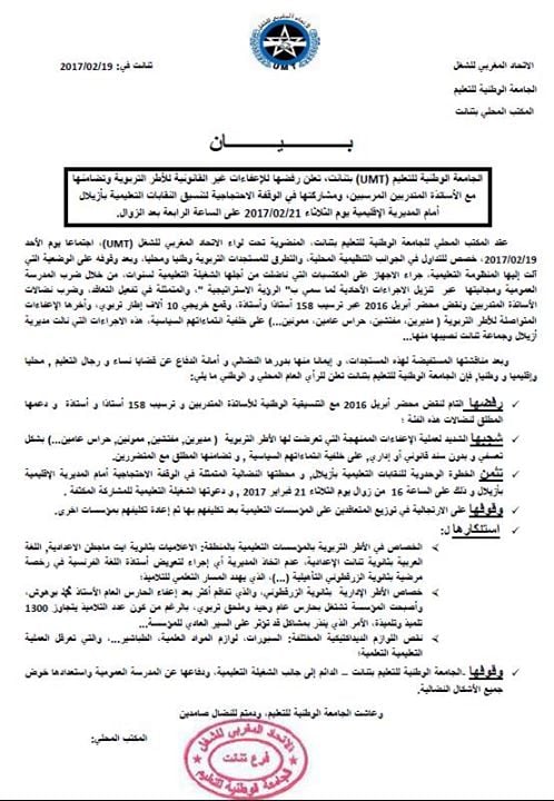 نقابة الاتحاد المغربي للشغل أعلنت عن مشاركتها في الوقفة الاحتجاجية التي أعلنت عنها نقابات وجمعيات تعليمية أمام مديرية التعليم بأزيلال غدا الثلاثاء .