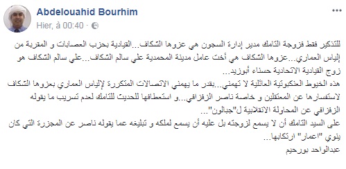 وقال بورحيم في تدوينته، "للتذكير فقط فزوجة التامك مدير إدارة السجون هي عزوها الشكاف...القيادية بحزب العصابات و المقربة من إلياس العماري...عزوها الشكاف هي أخت عامل مدينة المحمدية علي سالم الشكاف...علي سالم الشكاف هو زوج القيادية الاتحادية حسناء أبوزيد...هذه الخيوط العنكبوتية العائلية لا تهمني...بقدر ما يهمني الاتصالات المتكررة لإلياس العماري بعزوها الشكاف لاستفسارها عن المعتقلين و خاصة ناصر الزفزافي...و استعطافها للحديث للتامك لعدم تسريب ما يقوله الزفزافي عن المحاولة الانقلابية ل"جبالون"....".