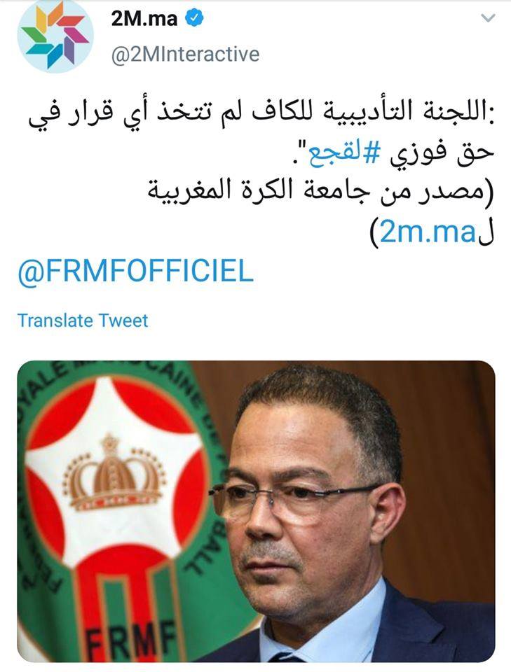 ونشرت القناة على حسابها ب"التويتر" تغريدة جاء فيها "اللجنة التأديبية للكاف لم تتخذ أي قرار في حق فوزي لقجع"، مصدر من جامعة الكرة المغربية ل2m.ma".