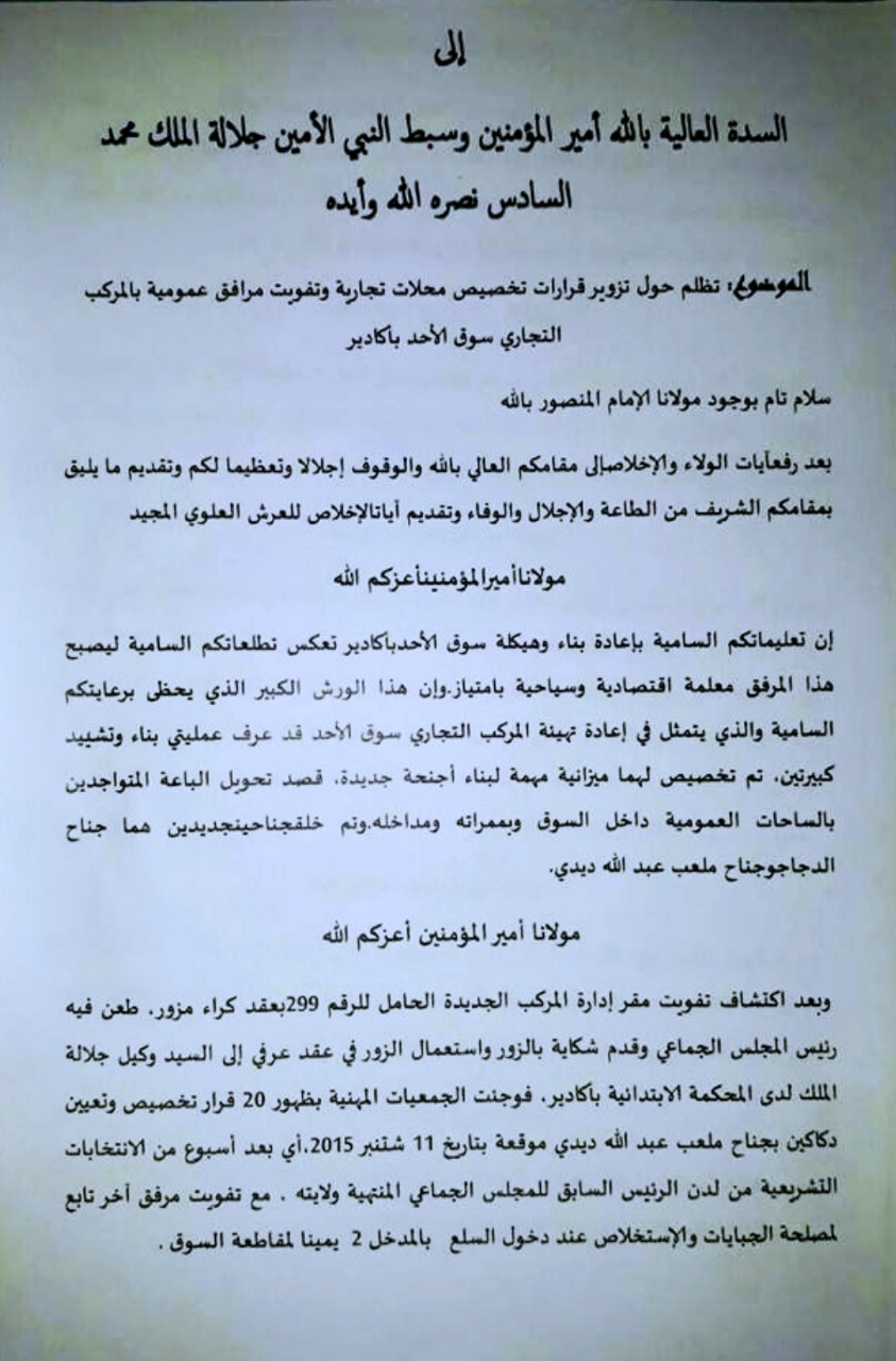 معطيات خطيرة جدا، تلك التي تضمنتها رسالة وجهها تجار المركب التجاري سوق الأحد بأكادير، إلى الديوان الملكي، كشفوا عبرها عن تراجع رئيس بلدية أكادير الحضور للدعوى القضائية التي قال بأنه رفعها ضد صهره، الذي اتهمه بتزوير أوراق محل تجاري بالسوق.