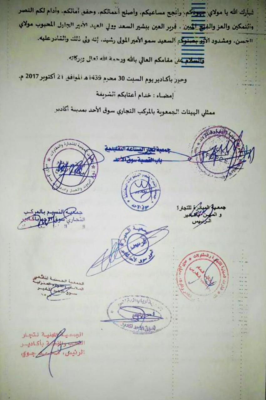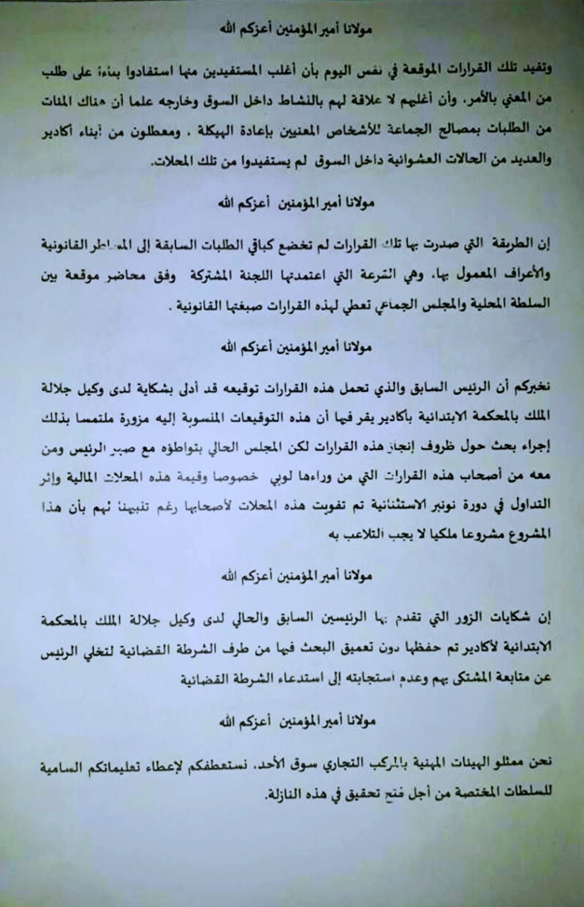 وأوضح التجار أن الرئيس السابق والذي تحمل القرارات توقيعه قد أدلى بشكاية لدى وكيل الملك بالمحكمة الابتدائية بأكادير يقر فيها أن هذه التوقيعات المنسوبة إليه مزورة، ملتمسا بذلك إجراء بحث حول ظروف إنجاز هذه القرارات، لكن المجلس الحالي و بتواطئه مع صهر الرئيس ومن معه من أصحاب هذه القرارات التي من ورائها لوبي خصوصا وقيمة هذه المحلات المالية وإثر التداول في دورة نونبر الاستثنائية تم تفويت هذه المحلات لأصحابها رغم تنبيهنا لهم بأن هذا المشروع مشروع ملكي لا يجب التلاعب به.