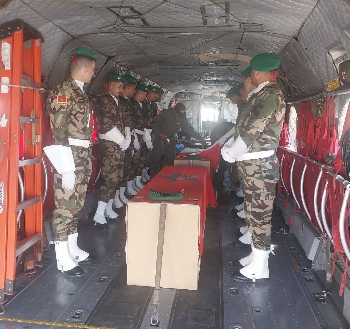 هذا وسارعت القوات المسلحة الملكية إلى تأمين نقل جثماني العريفين فيصل مجاهد ومحمد حسناوي بواسطة مروحية عسكرية، حيث جرت مراسم الدفن بكل من بزو بإقليم أزيلال وعين كيشر بمدينة وادي زم، وسط أجواء مهيبة شهدت حضوراً رسمياً وعسكرياً، بمشاركة السلطات المحلية والدرك الملكي والقوات المساعدة.