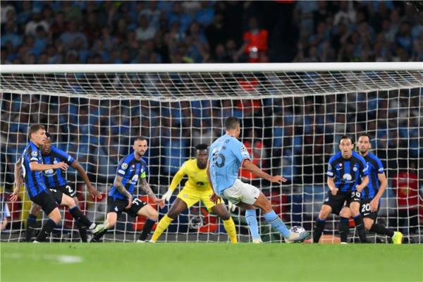 وبدأت المباراة بصلابة دفاعية من إنتر، واحتاج سيتي إلى 27 دقيقة قبل أن يصنع كيفن دي بروين أول فرصة خطيرة حيث مرر كرة أرضية إلى إرلينغ هالاند الذي سدد كرة قوية أنقذها الحارس أندريه أونانا.