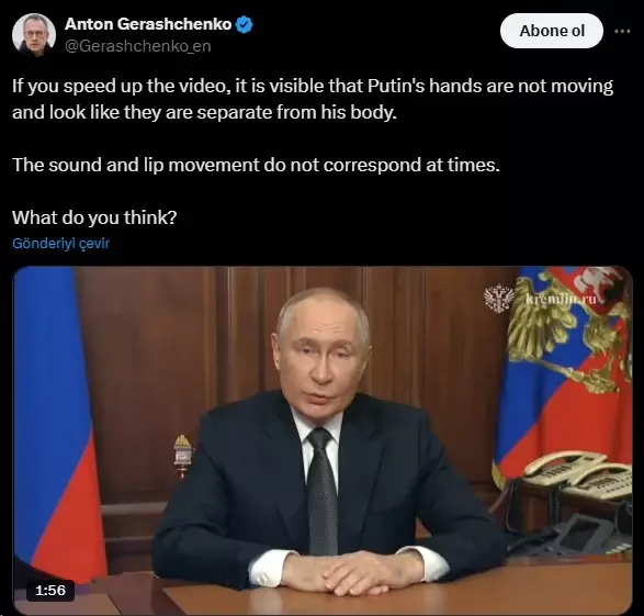 انتشر مقطع فيديو مدته 7 دقائق و47 ثانية نشره الرئيس الروسي فلاديمير بوتين عبر حسابه الرسمي من داخل الكرملين، ليصبح حديث وسائل التواصل الاجتماعي. حيث ظهر الرئيس الروسي جالسًا خلف طاولة كبيرة وهو يدلي بإعلان رسمي، لكن ما لفت انتباه المشاهدين هو عدم تحريك يديه طوال فترة الفيديو.