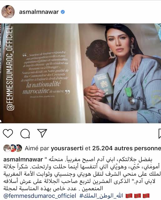 وقالت لمنور في تدوينة على الأنستغرام "بفضل جلالتكم، ابني آدم أصبح مغربياً".