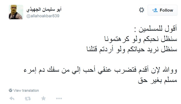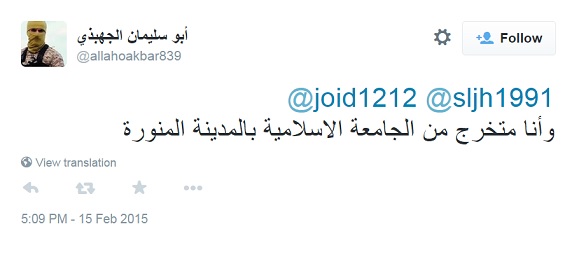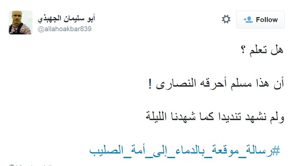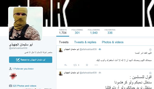 ويظهر حساب الجهبذي انتمائه الواضح إلى التنظيم، إلا أنه يخلو من أي إشارة لمشاركته في عملية الذبح.