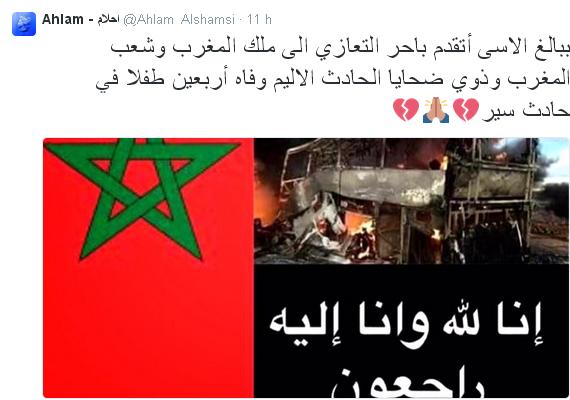 قدمت الفنانة الإماراتية أحلام تعازيها للملك محمد السادس والشعب المغربي، بعد فاجعة طانطان التي ذهب ضحيتها 33 شخصا أغلبهم أطفال رياضيون ، صباح أمس الجمعة، نتيجة تصادم بين حافلة وشاحنة قرب طانطان.