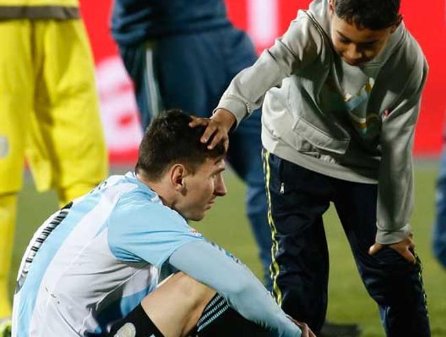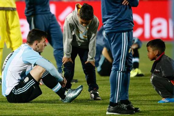 بعد فشله في الفوز بلقب كوبا أمريكا رفقة منتخب بلاده، التقطت عدسات المصورين صور للنجم الارجنتيني ليونيل ميسي و هو جالس على أرضية الملعب الوطني ، في الوقت الذي اقترب منه طفلين من الشيلي انشغلا بمواساة الأسطورة بدل الفرحة بتتويج منتخب بلادهم.