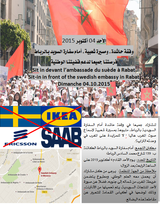 و تشارك في هذه المسيرة المقررة يوم الاحد المقبل 4 أكتوبر على الساعة الرابعة بعد الزوال، أمام مقر سفارة دولة السويد بالرباط، مختلف الأحزاب التمثيليات النقابية والهيئات الحقوقية ومنظمات المجتمع المدني.