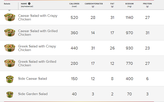 وبحسب موقع ماكدونالدز للتغذية فإن سلطة الكرنب تحتوي على 520 سعرة حرارية، منها 31 غرام دهون و1140 غرام صوديوم، وبإضافة صلصة السيزر، ترتفع سعراتها الحرارية إلى 730 سعرة حرارية، منها 53 غرام دهون و1400 غرام صوديوم.