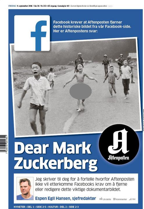 جاءت هذه الرسالة بعد أن نشرت "افتنبوستن" على الفيسبوك مقالة عن صور الحروب تضمنت الصورة الشهيرة لكيم فوك، الطفلة الفيتنامية التي فرت عارية من قنابل النابالم خلال حرب فيتنام. المصور نيك أوت، الذي التقط هذه اللحظة التاريخية، تم تكريمه وحصل على جائزة بوليتزر، التي تقدمها جامعة كولومبيا بنيويورك في مجالات الصحافة والآداب والموسيقى، لكن فيسبوك اعتبرت الصورة "تتضمن الكثير من العري"،