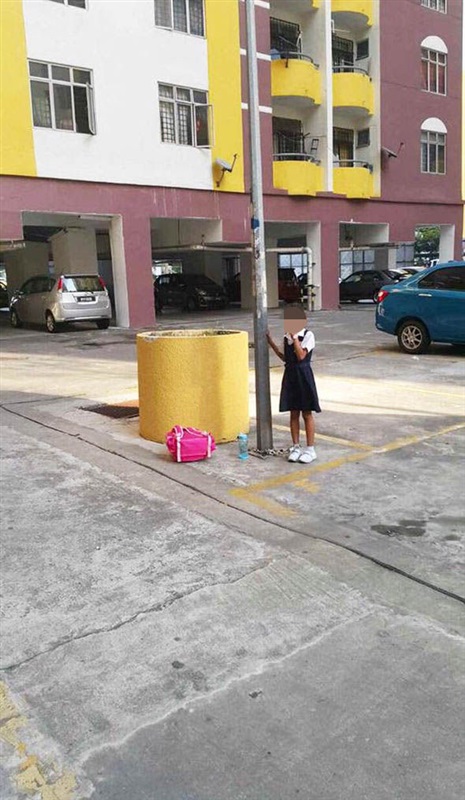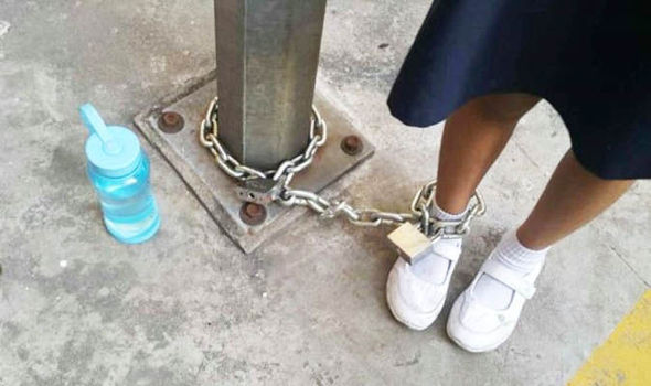 ظهرت الفتاة في الصورة ترتدي الزي المدرسي وكاحلها الأيمن مربوط بسلسلة مقفلة بأقفال معدنية، في حين تركت الأم زجاجة المياه وحقيبتها على الأرض بجوارها.