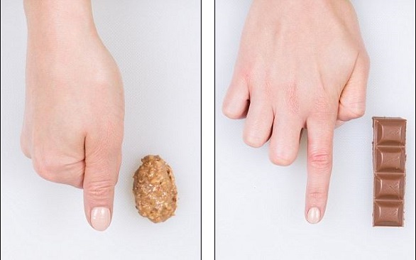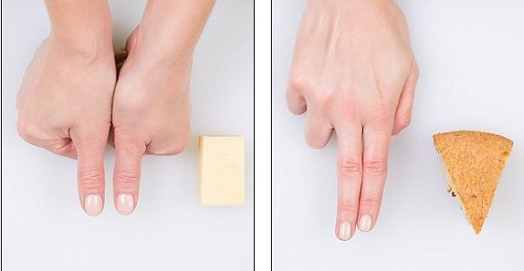 وبوضع إصبعي الإبهام لكلتا اليدين متجاورين، تكون هذه المساحة عرضاً وطولاً حجم قطعة الحلوى أو الجبن التي يجب أن يتناولها الشخص، وإصبع السبابة تشير لحجم وطول قطعة الشوكولا التي يجب أن تؤكل.