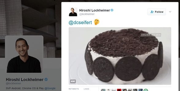 وقام نائب رئيس غوغل لأندرويد وكروم أو إس هيروشي لوكهيمر، بنشر صورة لكعكة مصنوعة من حلوى أوريو Oreo، على حسابه، وذلك في إشارة إلى إمكانية إطلاق الإسم على الإصدار القادم من أندرويد.
