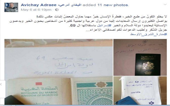 و نشر أدرعي مجموعة من التهنئات بجوازات سفر عربية و مغربية، و علق عليها " لا يخلو الكونُ من طبع الخيرِ، ففِطرةُ الإنسان خيرٌ مهما حاول البعضُ إثباتَ عكسِ ذلك! …يواصل الكثيرون إرسال المعايدات إلينا من دول عربية واجنبية كثيرة من أشخاصٍ يحبون الخير ويدعمون الإنسانيّة ليعايدوا دولة السلام والخير إسرائيل باستقلالها الـ 69 ".