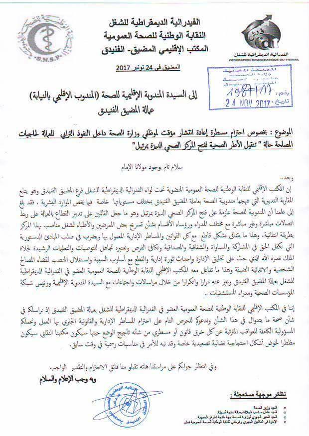 إننا في المكتب الإقليمي للنقابة الوطنية للصحة العمومية العضو في الفدرالية الديمقراطية للشغل بعمالة المضيق الفنيدق إذ نراسلكم في شأن صحة ما يتدوال في هذا الشأن، وندعوكم للحرص التام على احترام المساطر الإدارية والقانونية الجاري بها العمل ونحملكم المسؤولية الكاملة للعواقب المترتبة عن كل خرق قانون أو مسطري من شأنه تأجيج الوضع، حينها سيكون مكتبنا النقابي مضطرا لخوض أشكال احتجاجية نضالية تصعيدية خاصة وقد نبه للأمر في مناسبات رسمية في وقت سابق.