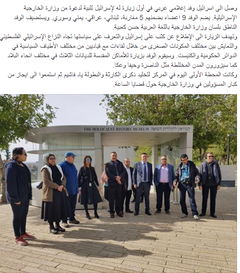 نشرت وزارة الخارجية الإسرائيلية على صفحتها الرسمية، خبرا مفاده وصول وفد عربي إعلامي يتكون من 9 أفراد، 5 منهم مغاربة، لبناني، عراقي، يمني، وسوري، (وصول الوفد) إلى الأراضي الإسرائيلية.