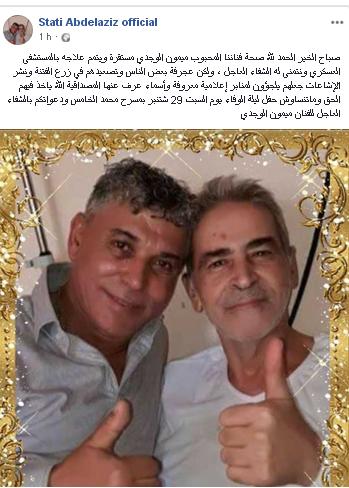 وقال الستاتي في تدوينة فايسبوكية "الحمد لله صحة فناننا المحبوب ميمون الوجدي مستقرة ويتمم علاجه بالمستشفى العسكري ونتمنى له الشفاء العاجل".