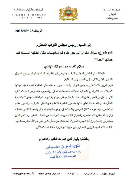وجه نور الدين مضيان، رئيس الفريق الاستقلالي للوحدة والتعادلية بمجلس النواب، سؤالا شفويا إلى وزير الداخلية، عبد الوافي لفتيت، حول ملابسات مقتل الطالبة التطوانية "حياة" برصاص البحرية الملكية.