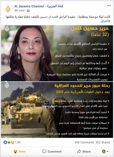 سقطت قناة الجزيرة القطرية، في خطأ غريب بعد نشرها صورة للممثلة المغربية لبنى أبيضار، على أساس أنها حفيدة الرئيس العراقي السابق صدام حسين.