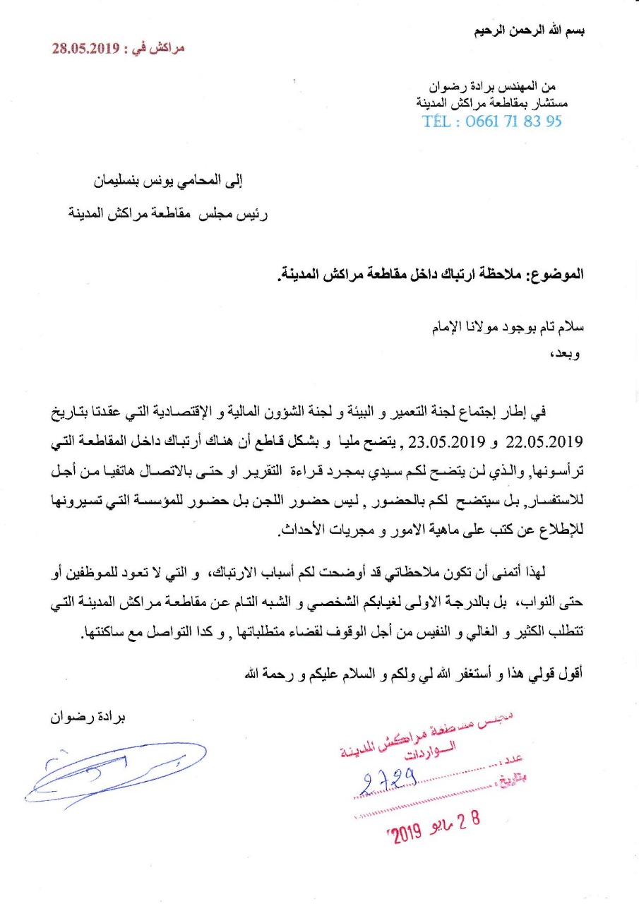 إشتكى المستشار الشاب رضوان برادة من الإرتباك السائد داخل مقاطعة مراكش المدينة، ما أرجعه للغياب الشخصي والشبه التام لزميله في حزب العدالة والتنمية ورئيس المقاطعة، يونس بنسليمان.