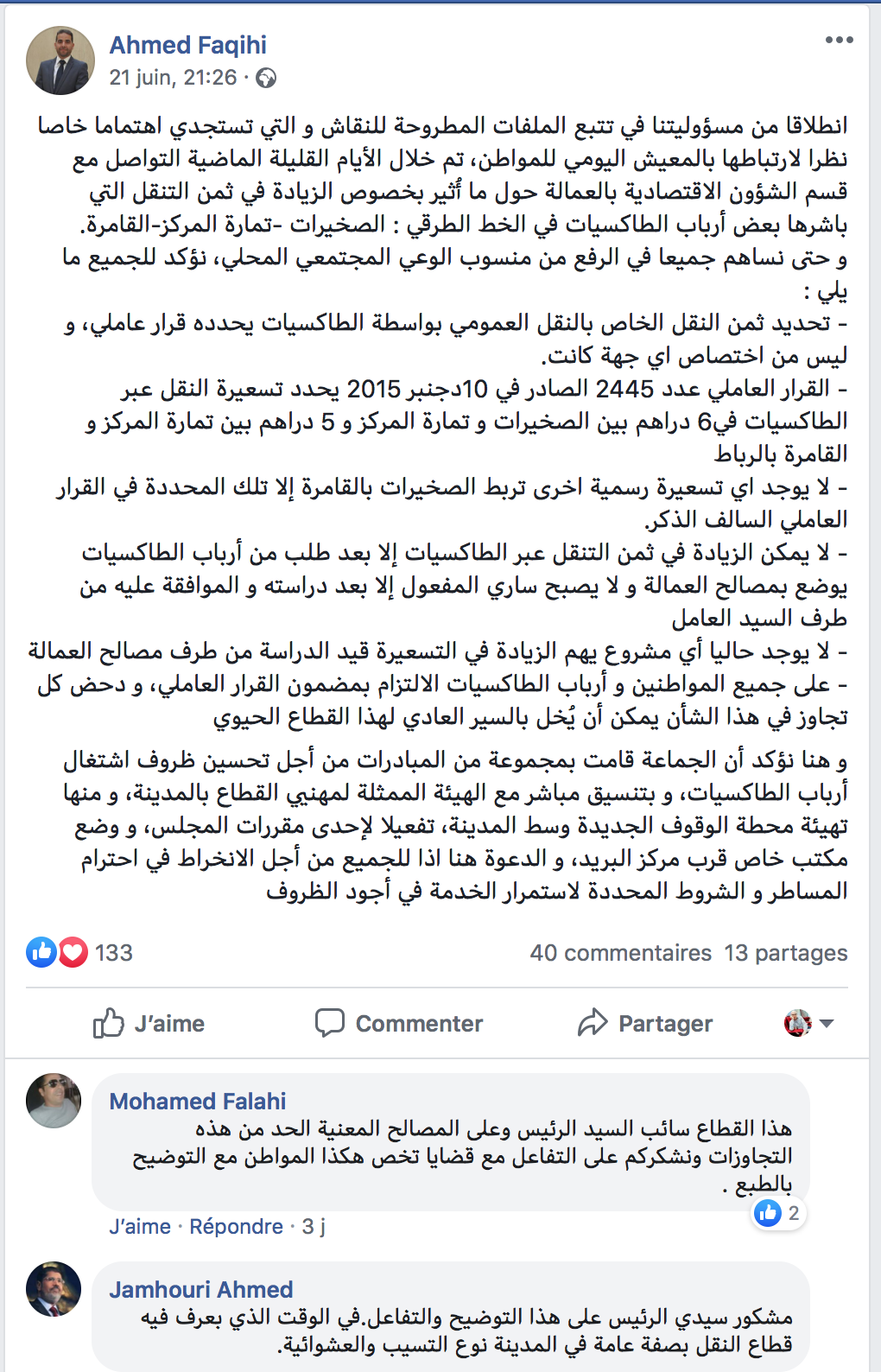 ومن جانبه أكد السيد أحمد فاقيهي، رئيس جماعة الصخيرات، عبر بيان للرأي العام، أن تحديد ثمن النقل الخاص بالنقل العمومي بواسطة الطاكسيات يحدده قرار عاملي، و ليس من اختصاص أي جهة كانت، مشيرا إلى أن القرار العاملي عدد 2445 الصادر في 10دجنبر 2015 يحدد تسعيرة النقل عبر الطاكسيات في 6 دراهم بين الصخيرات وتمارة المركز و5 دراهم بين تمارة المركز و القامرة بالرباط، وعليه، لا توجد أي تسعيرة رسمية أخرى تربط الصخيرات بالقامرة إلا تلك المحددة في القرار العاملي السالف الذكر، موضحا أنه لا يمكن الزيادة في ثمن التنقل عبر الطاكسيات إلا بعد طلب من أرباب الطاكسيات يوضع بمصالح العمالة و لا يصبح ساري المفعول إلا بعد دراسته والموافقة عليه من طرف السيد العامل.