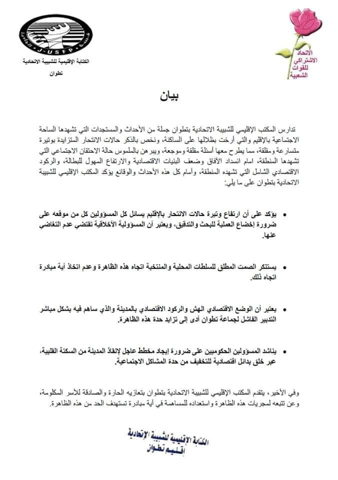 خرجت الشبيبة الاتحادية بمدينة تطوان ببيان تستنكر فيه صمت الجهات المسؤولة التي لم تتحرك لمعرفة الأسباب الرئيسية للإنتحار بإقليم تطوان.