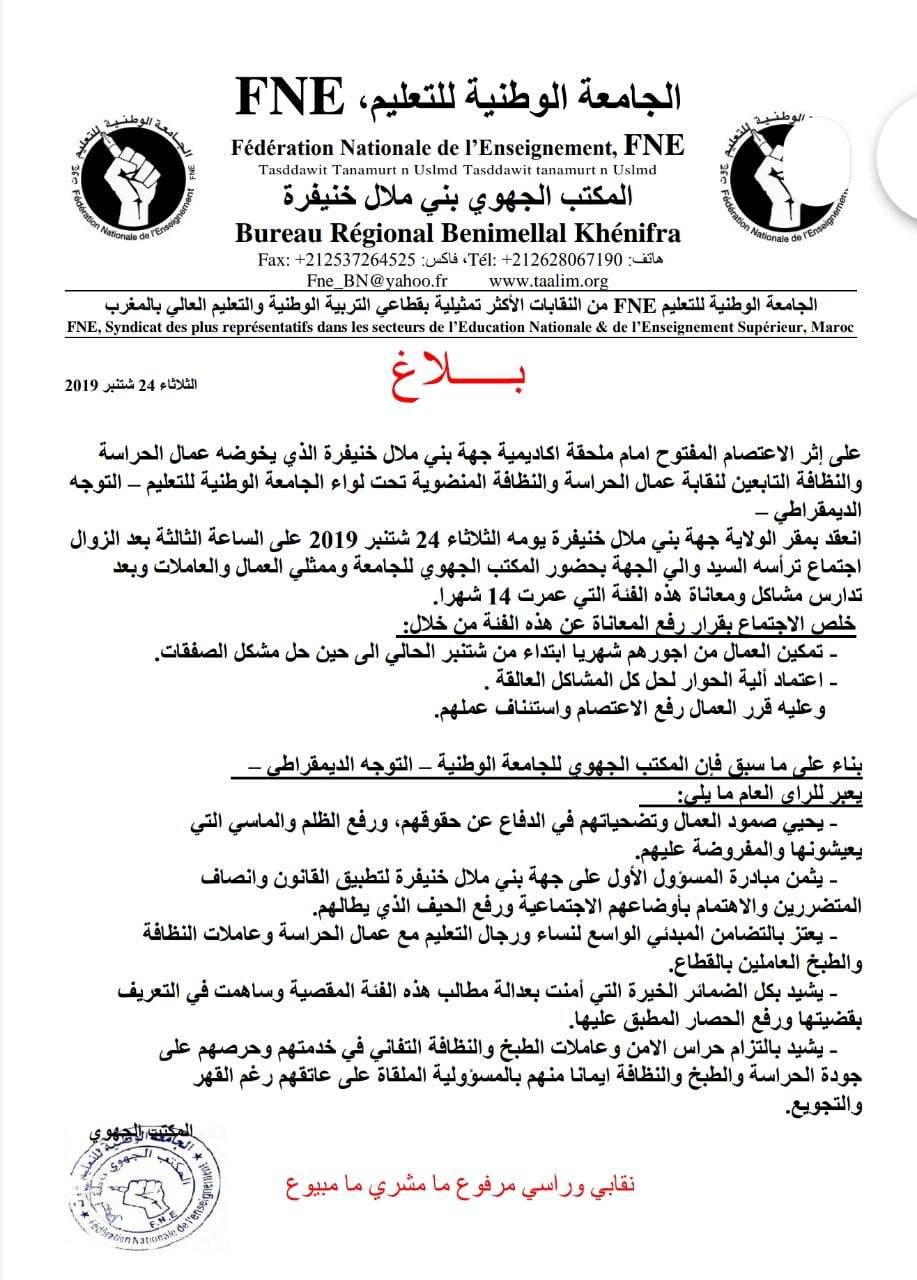 على إثر الاعتصام المفتوح الذي خاضه عمال الحراسة والنظافة التابعين لنقابة عمال الحراسة والنظافة المنضوية تحت لواء الجامعة الوطنية للتعليم -التوجه الديمقراطي- أمام ملحقة اكاديمية جهة بني ملال خنيفرة، ترأس والي الجهة زوال أول أمس الثلاثاء، اجتماعا حضره المكتب الجهوي للجامعة وممثلي العمال والعاملات، خصص لتدارس مشاكل ومعاناة هذه الفئة التي عمرت 14 شهرا.