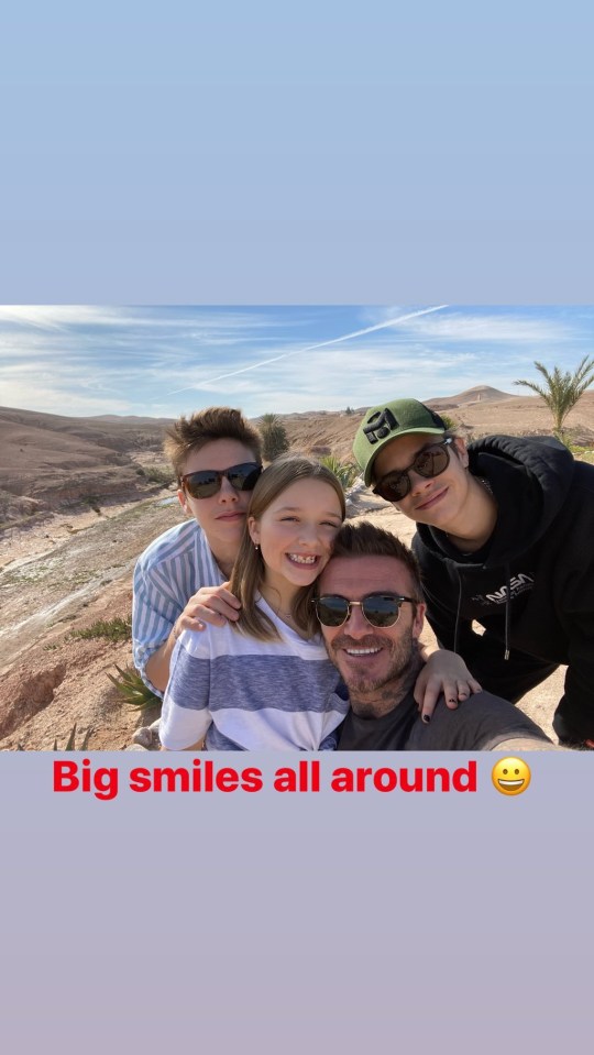 ونشر بيكهام صورا ومقاطع فيديو من عطلته في المغرب، رفقة زوجته النجمة العالمية ومصممة الأزياء الشهيرة فيكتوريا بيكهام، رفقة أبنائهما الثلاثة.