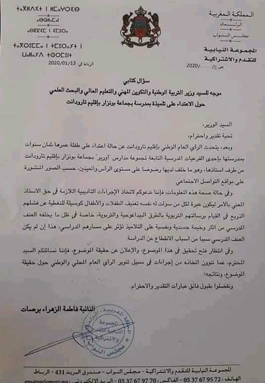 وتتهم البرلمانية عن حزب التقدم والاشتراكية، حسب السؤال، الأستاذ بالوقوف وراء التعنيف، مطالبة وزارة أمزازي باتخاذ الإجراءات التأديبية في حقه، مُستبقةً التحقيقات التي لم تكشف بعد عن الفاعل الحقيقي وراء الاعتداء على الطفلة.