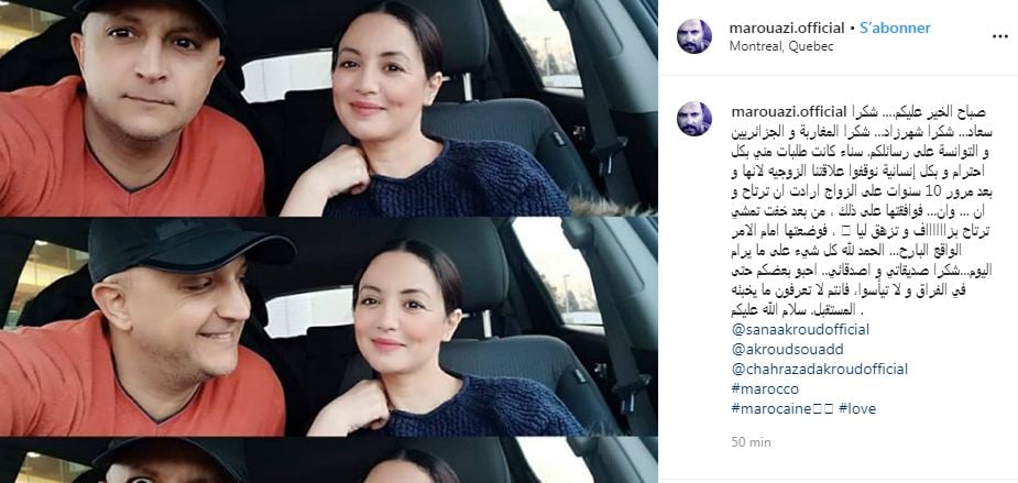 نشر الممثل المغربي محمد مروازي، صورة له مع طليقته سناء عكرود، على "إنستغرام"، وأرفقها بتدوينة شكر فيها متتبعيه وكذا شقيقتيها الذين ساهموا في تحقيق الصلح بينهما.